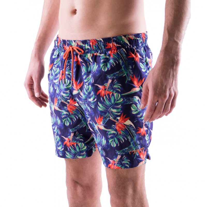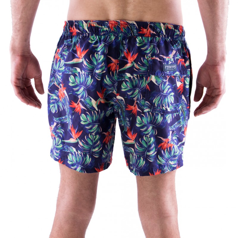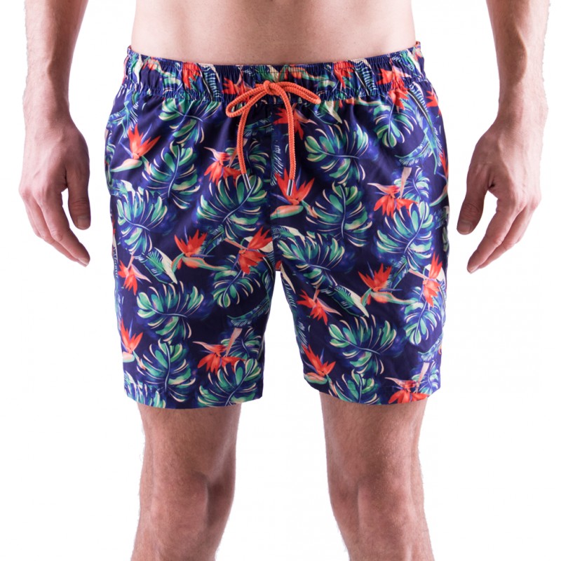 El bañador es de cintura elástica ajustable con cordón, el cual ha sido confeccionado con colores a juego con el bañador y tiene un acabado metálico con el logo de la marca. Bolsillos laterales y bolsillo trasero con el logo.